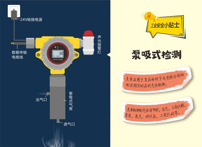 泵吸在線式氣體探測器一般適用于人不宜進(jìn)去的地方,或在作業(yè)人員進(jìn)入之前,就必須進(jìn)行檢測的地方。如坑道、管道、下水道、密閉糧倉、罐體等環(huán)境。也可以在氣室進(jìn)氣口接入通氣長管,遠(yuǎn)距離進(jìn)行吸氣采樣。檢測速度快,準(zhǔn)確率也比較高。