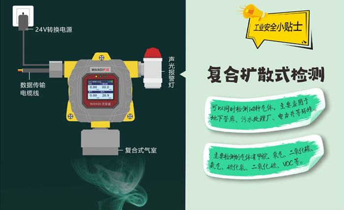 擴(kuò)散在線式氣體探測器能夠?qū)崟r的檢查空氣中是否含有一種或多種可燃及有毒有害氣體,一般使用于開放場合,如敞開的作業(yè)車間,檢測空氣中泄露的氣體。這種方法受檢測環(huán)境的影響,如環(huán)境溫濕度、風(fēng)速風(fēng)向等,監(jiān)測數(shù)據(jù)會存在一定的誤差。