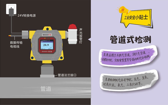 管道在線式氣體探測器適用于管道流速不高、常溫常壓、無粉塵油污、無干擾氣體的環(huán)境下進(jìn)行檢測分析。一般應(yīng)用于密閉管道、過程控制、科學(xué)實驗等領(lǐng)域。